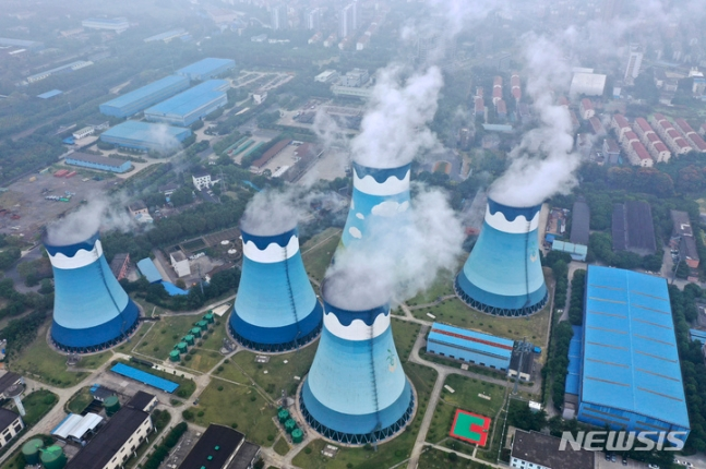 [난징(중국 장쑤성)=AP/뉴시스] 중국에서 전력 부족으로 정전 사태가 빚어지면서 10여 개 성(省) 지역에서 전력 사용 제한 조치가 내려졌다. 27일 중국 장쑤성 난닝에 있는 한 석탄 화력 발전소에서 연기가 배출되고 있다. *재판매 및 DB 금지