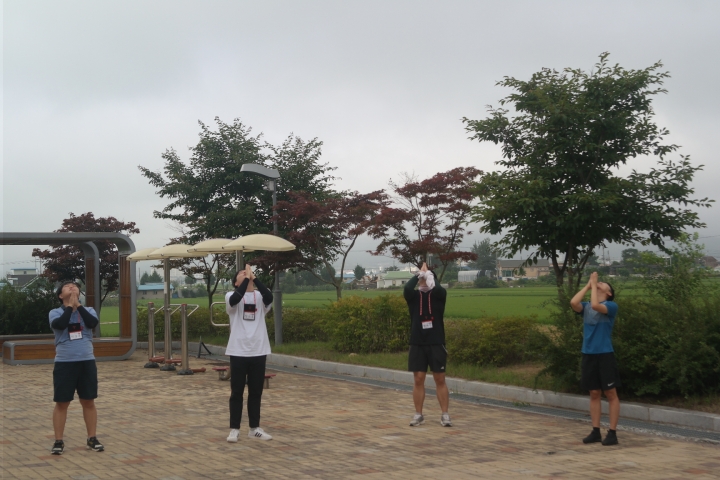 간단한 체조 후에, 팀별로 2일차 도보순례 출~발~