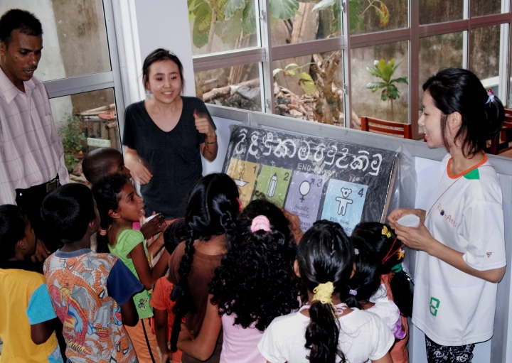 ▲ 2012년 스리랑카 모라투와에서 진행된 End poverty 캠페인 활동 모습의 일부 : 지역 아이들에게 MDGs 항목을 쉽게 설명하고 재활용 저금통을 만드는 미술 프로그램 운영