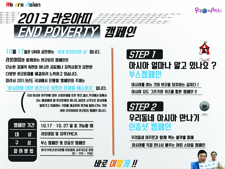 라온아띠와 함께하는 End Poverty(빈곤퇴치)캠페인은 빈곤의 개념을 단순한 경제적 측면에만 그치지 않고, 각 공동체나 지역사회가 직면하고 있는 다양한 빈곤 문제들로 확대하여 그를 해결하려 노력하는 행동을 촉구하는 캠페인입니다.