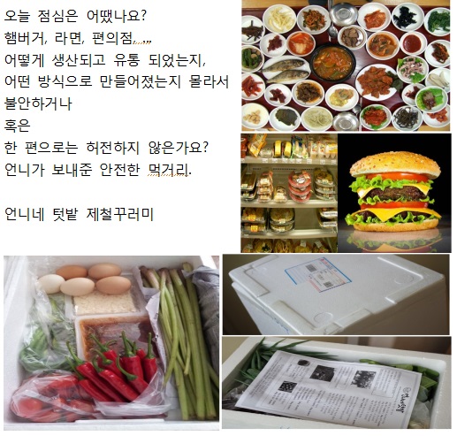 언니네 텃밭은 우리의 언니들이 직접 농사를 짓고 가장 잘 지어진 농작물만을 골라서 소비자들에게 제공합니다. 이것이 바로 ‘제철 꾸러미’죠. 말 그대로 철에 맞게 잘 지어진, 가장 건강하고 맛있게 농작한 농산물로 제철 꾸러미를 구성합니다. 엄마가 보내준 것 같은 느낌의 꾸러미는 소비자들에게 따뜻한 온정마저 느끼게 만듭니다. 그리고 언제라도 아이들과 함께 언니네 텃밭을 방문할 수 있습니다.