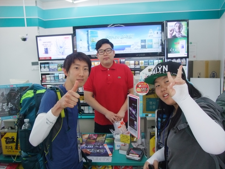 그러던 중 팀원들의 배고픔의 욕구로 인해 우리는 편의점을 들어갑니다~~ 그런데!! 편의점 알바생은 우리의 구세주~~~ 우리가 큰 배낭을 들고 뭘 먹을까 고민을 하고 또 고민을 하니깐.... 우리에게 김밥과 우유와 물티슈를 잔뜩 주십니다....