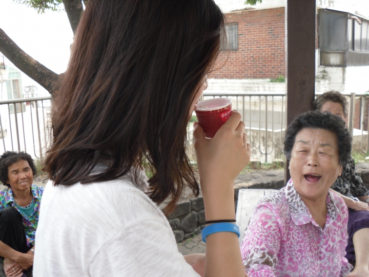 마을 윗 중턱에 있는 정자에서 할머니가 혜경이한테 얼음물을 주시는데 종이컵 대신 요플레 통에 주시는 할머니!