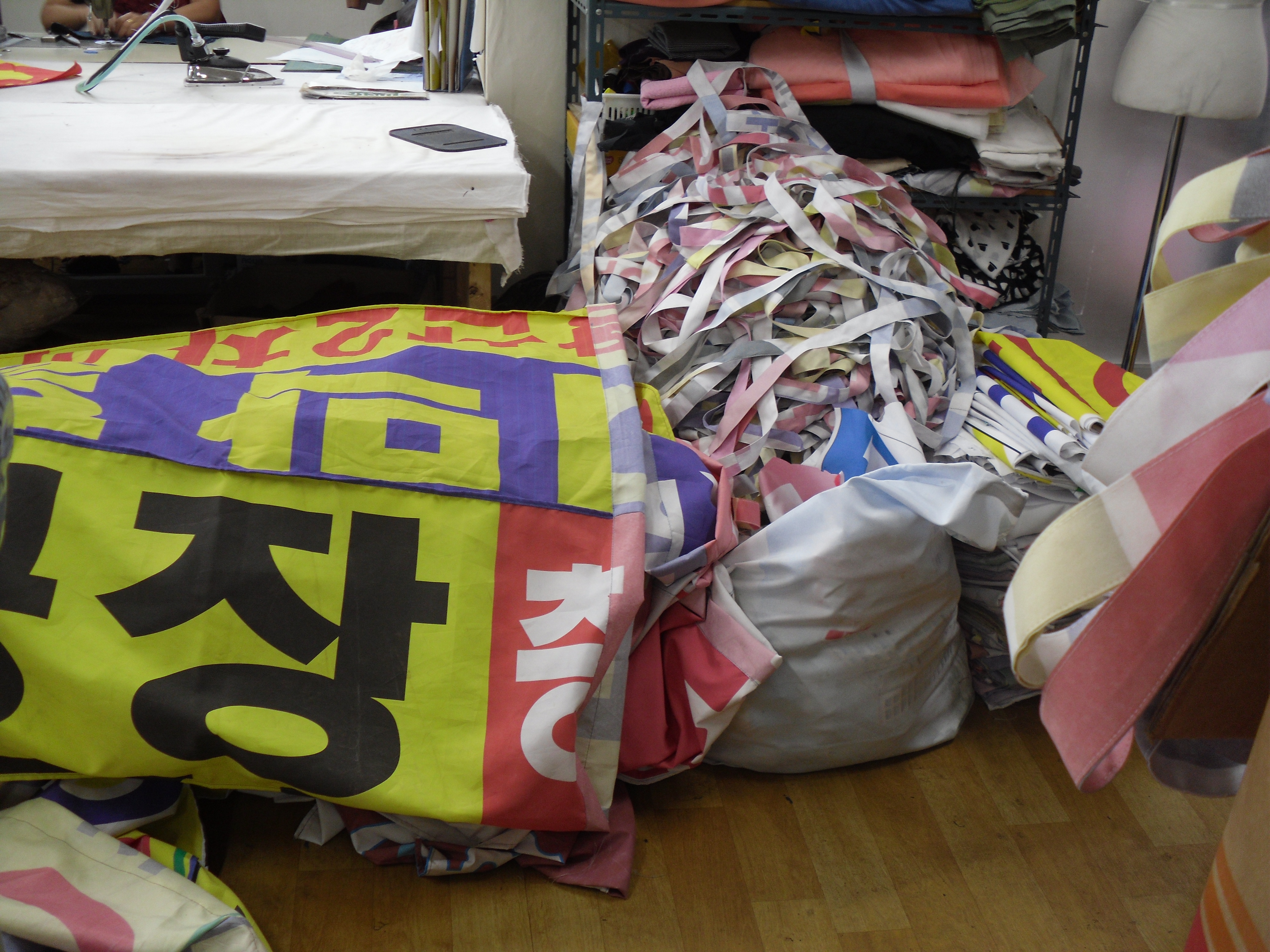 여러 분들이 모이셔서 현수막을 가지고 가방을 만들고 계셨습니다. 가방 참 이쁘지 않나요?