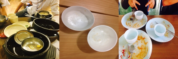 수원Y에서 먹을 때는 요리의 양을 조절할 수 있지만, 바깥에서 식사를 하게 되면 원하지 않아도 갖가지 반찬들이 나오고 식사량도 조절할 수 없어서 잔반 줄이기가 힘들었고, 또 편식이 있는 팀원은 원하지 않는 식재료 때문에 식사시간이 즐겁지 않게 되었습니다. 그래도 의지의 깐달팀!! 다음부터 식당을 갈 때면 식사 전에 안 먹는 반찬을 치워달라고 부탁드리고 위가 작은 여자 팀원들은 하나를 시켜 나눠먹기도 했습니다!