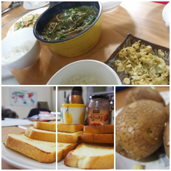 첫 번째로는 감자를 두 번째에는 빵을 마지막으로는 냉이된장국과 달걀 그리고 애호박부침을 통해 실천해보았습니다.