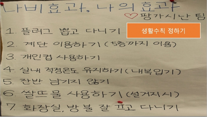 일단 저희 팀은 나비효과 나의효과 생활수칙을 정하고 이를 실천하기위해 노력하였는데요*^-^*
