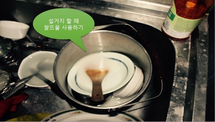 세번째는 쌀 씻고 남은 물 버리지 않고 쌀뜨물을 받아두어 나중에 설거지 할 때 씻기 전에 쌀뜨물 이용하기