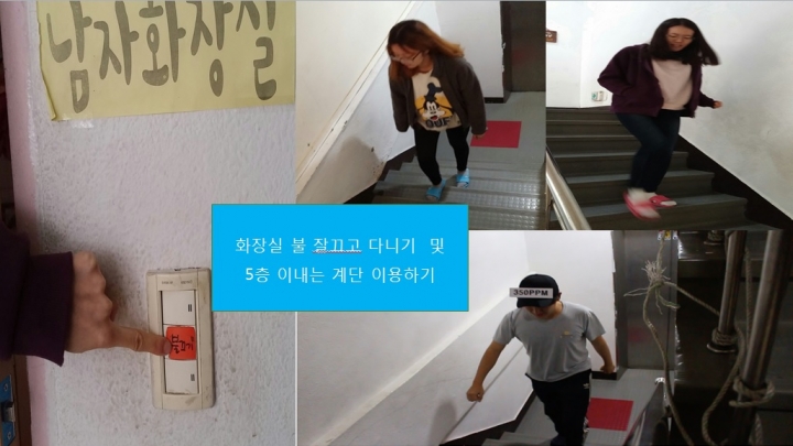 일곱번째 안쓰는 화장실 및 방은 불끄고 다니며 5층이내는 엘리베이터 타지않고 계단을 주로 이용