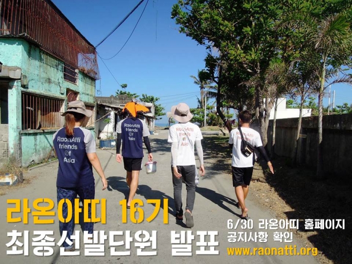 아울러 라온아띠 16기 대학생 해외봉사단 지원자 모두에게 감사를 드리며 함께 하지 못한 분들에게 위로와 아쉬움을 전해 드립니다.
